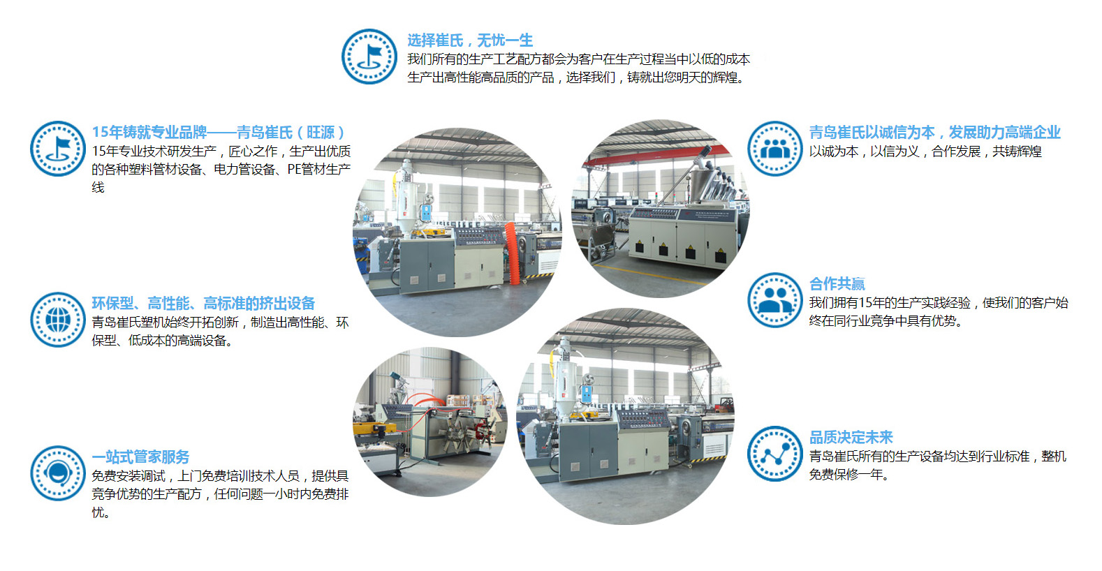 青島崔氏塑料機(jī)械有限公司始終以開(kāi)拓創(chuàng)新的精神,緊跟世界塑機(jī)行業(yè)的發(fā)展趨勢(shì),專(zhuān)注研發(fā)與生產(chǎn)預(yù)應(yīng)力波紋管全線設(shè)備,公司已有20多年的生產(chǎn)與實(shí)踐經(jīng)驗(yàn),在市場(chǎng)大環(huán)境下,緊跟國(guó)家發(fā)展趨勢(shì),使我們的客戶在市場(chǎng)競(jìng)爭(zhēng)中有一席之地,人生就是不斷決定的過(guò)程、決定沒(méi)有對(duì)與錯(cuò),只有得與失!選擇崔氏我們定不負(fù)卿。